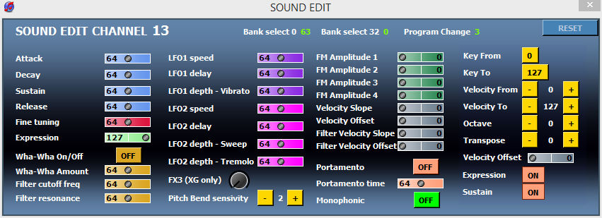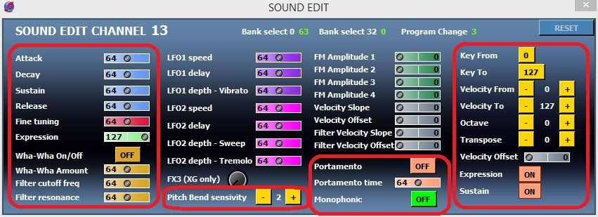 - Attack, Decay, Sustain, Release, Fine Tuning, expression, Cutoff (Filter Cutoff Freq), Resonance (Filter Resonance), Pitch Bend Sensitivity, Portamento On/off et Portamento Time, Mono/Poly, créer des splits avec Key from et Key to, régler les plages de vélocité, l'octave le transpose, le velocity offset, la réception ou non des données de sustain et expression.