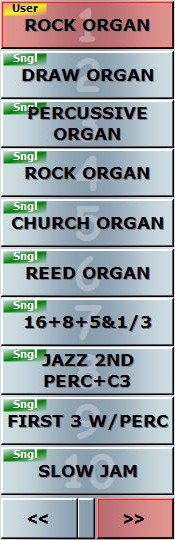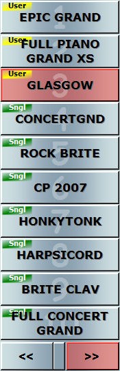 La liste des Voices PRESET Motif XS de piano s'affiche à droite, en premier il y a les voices GM et ensuite les PRESET, utilisez les flêches en bas "<<" ou ">>" pour faire défiler la liste :