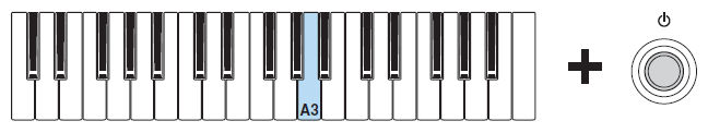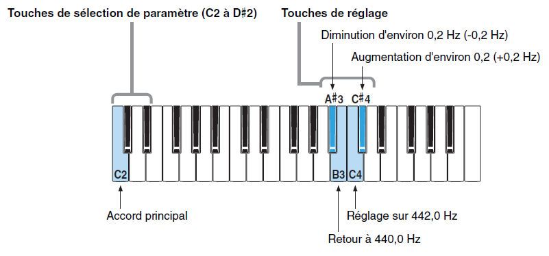 Tout en maintenant la touche C2, appuyez sur la touche A"3 pour diminuer la fréquence de 0.2 Hz, C#4 pour augmenter de 0.2 Hz.