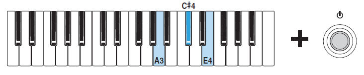 Tout en maintenant les touches A3, C#4 et E4 enfoncées, allumez votre Reface YC via son interrupteur, vous passez ainsi en mode de réglages avancés :