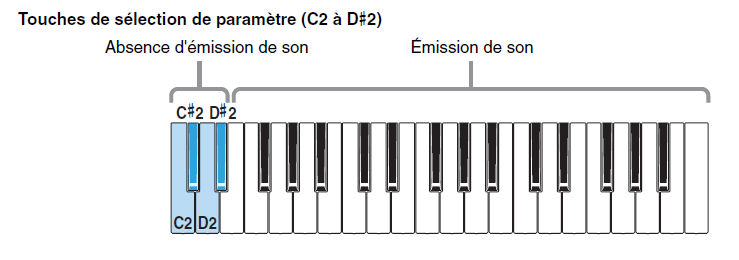 Maintenez la touche C2 enfoncée, appuyez sur l'une des touches comprises entre A#3 et C#4.