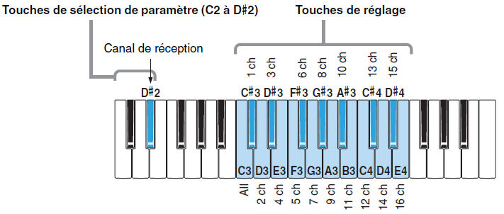 Le dessin ci-dessous vous indique la note qui doit être utilisée pour modifier le canal midi de réception selon votre choix :