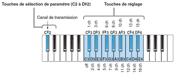 Le dessin ci-dessous vous indique la note qui doit être utilisée pour modifier le canal midi de transmission selon votre choix :