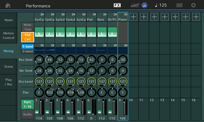 En quelque sorte, toujours si on reprend des termes Motif/MoXF, chaque part est "une mixing voice" mais pas de limitation à 256 comme en modes song/pattern du Motif/MoXF, toutes les parts de toutes les performances peuvent être éditées à tout niveau et TOUT est sauvegardé dans la performance, y compris les drum kits ce qui n'était pas possible sur le Motif/MoXF qui utilisaient un système de pointage vers la part en lieu et place d'importer toutes les données et de les intégrer au coeur de la performance comme pou rle Montage et le MODX.