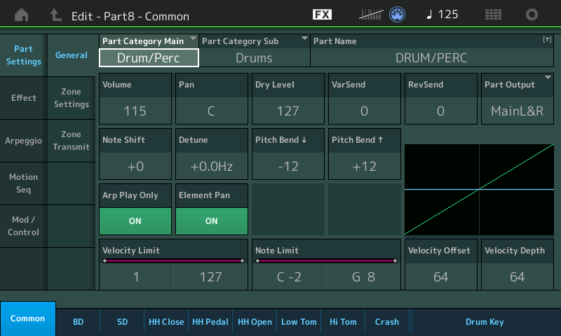 - Un niveau Common part qui sont les paramètres communs qui affecteront de la même manière tous les éléments qui composent une part : Part Settings, Effect (effets d'insertion et send vers les effets system), Arpeggios, Motion Seq et Mod Control :