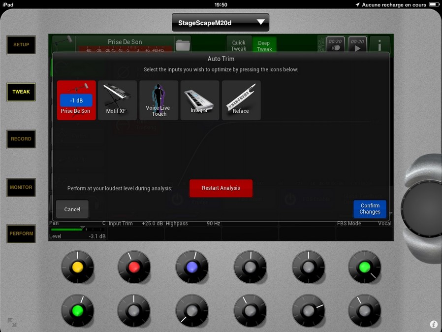 Une fois analysé, dans notre exemple, la M20d nous propose dde réduire le niveau d'entrée de 1 dB.