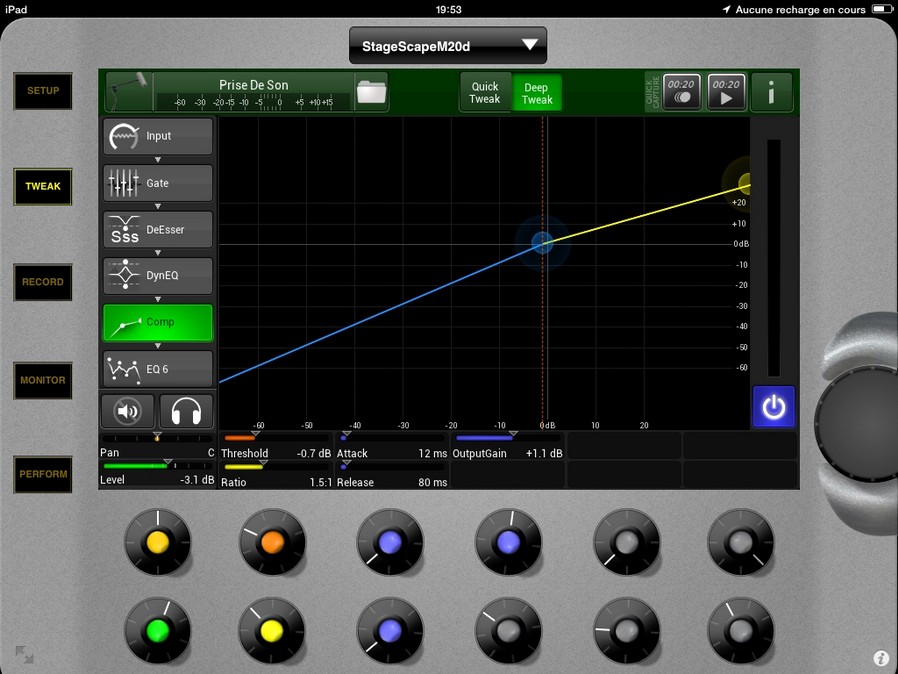Output Gain : encodeur bleu en haut au centre, réglages de -20 à +20 db, il détermine le niveau du signal de sortie du compresseur. On le visualise à l'écran par le point bleu, plus on monte le Level plus le point bleu se déplace vers le haut et plus le niveau de sortie est élevé.