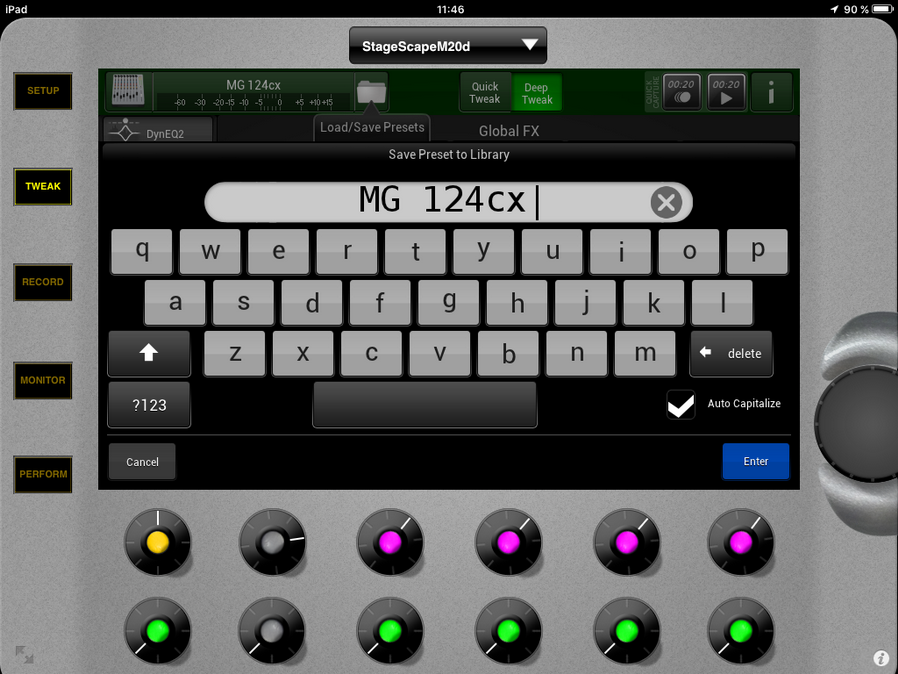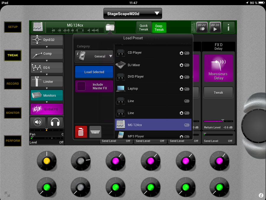 C'est pour cela que nous allons choisir ce DSP Preset. Même avec des câbles d'excellente qualité comme des Neutrix ou des Monster Cable dans mon cas, il y a toujours un souffle résiduel un peu en dessous des 60dB, sur un clavier c'est une chose, si cinq claviers et racks sont connectés sur la MG124cx, on commence à entendre du souffle à vide surtout si on a un bon volume en master et aussi sur un système d'écoute comme mes DXR12 Yamaha assez puissant sur scène qui va répercuter ce souffle qui est présent en entrée de la M20d. Le Noise Gate va permettre d'éliminer ce souffle à vide et le Limiter va empêcher une saturation sur un volume trop élevé. Voilà pourquoi j'ai choisi de vous montrer ce type de connexion en entrée 7/8. Il n'existe pas de type de DSP équivalent sur les entrées stéréo 13/14 et 15/16, on ne peut pas un sélectionner un. Lorsque c'est possible au niveau de vos entrées de 1 à 12, utilisez les pour votre synthés ou Workstation avec ce type de DSP Preset avec un Gate bien réglé, vous éliminerez ce souffle à vide.