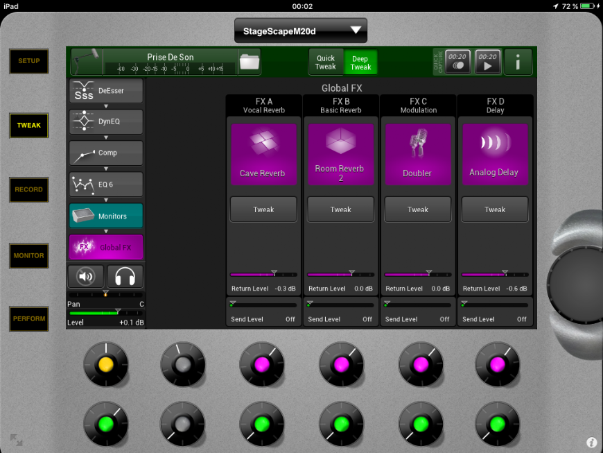 Si besoin ajustez le send level pour peaufiner votre réglage en revenant sur la page ou les 4 effets sont affiché en dessous du bouton tweak.