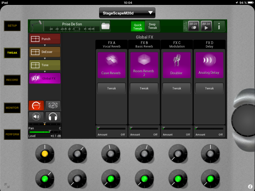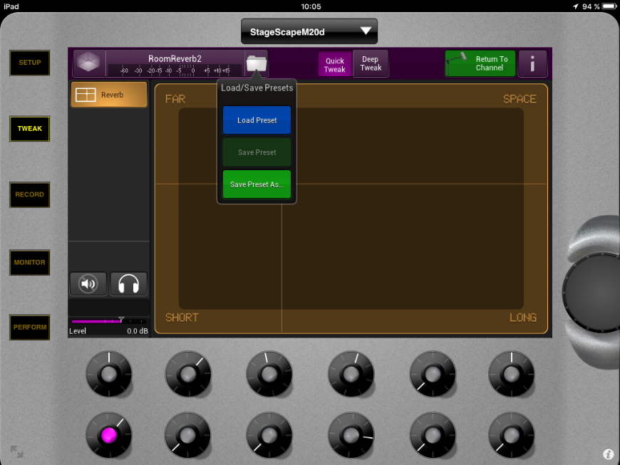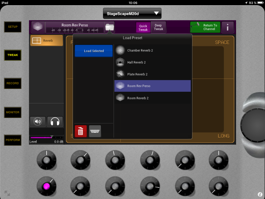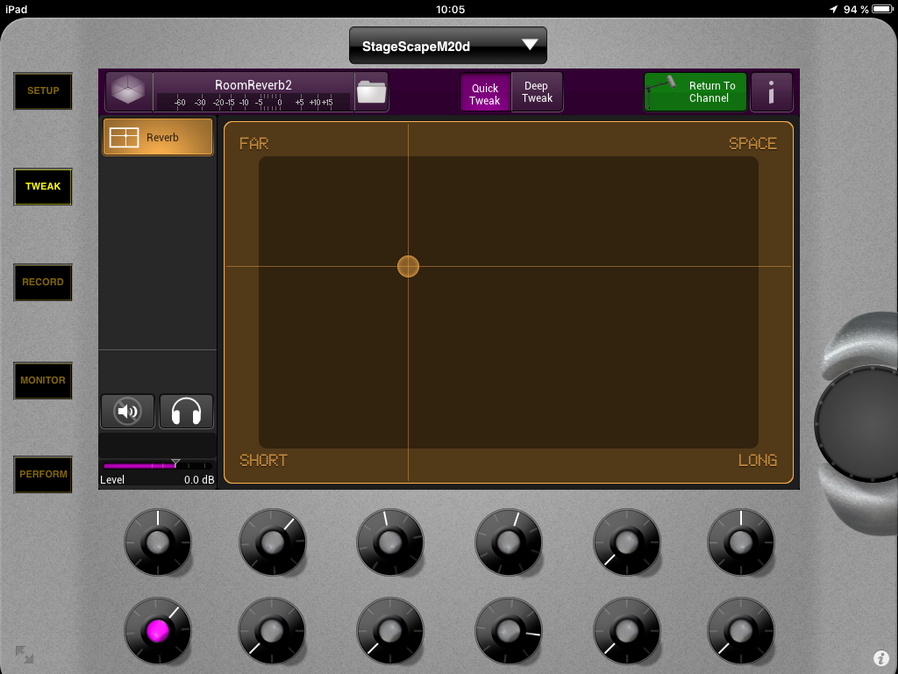 Pour accéder à l'édition des reverb basiques, cliquez sur votre setup ou votre scène sur un instrument ou un micro et appuyez sur tweak (ou faites un double clic sur l'encodeur de l'instrument ou du micro) :