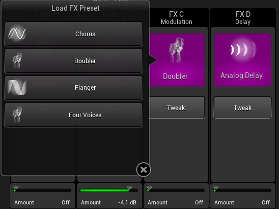 Si vous cliquez sur "Doubler" qui est le nom du preset de Modulation en FX C, vous voyez la liste des effets de Modulation disponibles : Chorus - Doubler - Flanger - 4 Voices, vous pouvez choisir celui de votre choix :