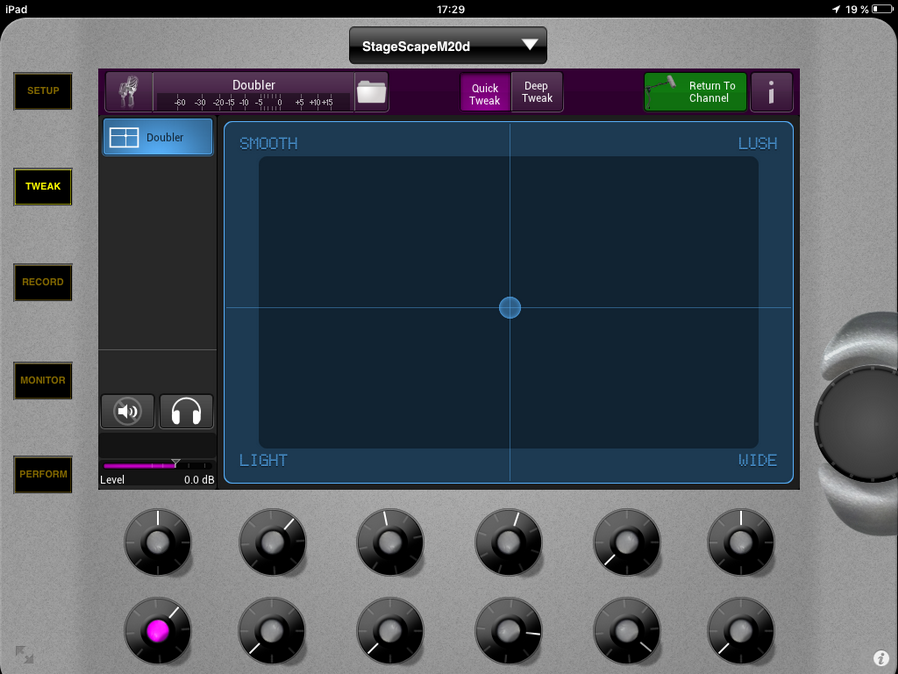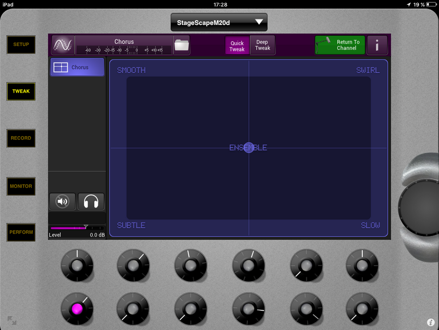 Pour accéder à l'édition des effets de Modulation, cliquez sur votre setup ou votre scène sur un instrument ou un micro et appuyez sur tweak (ou faites un double clic sur l'encodeur de l'instrument ou du micro) :