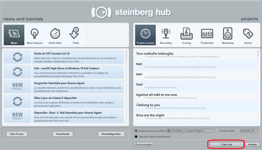 - Créer un nouveau projet vide depuis le Hub Steinberg :