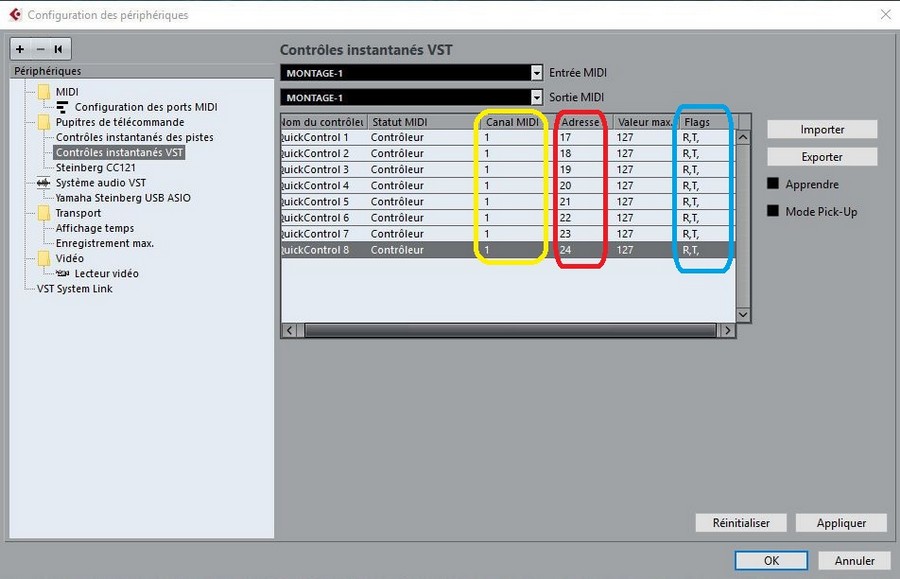 Dans Cubase les numéros de control change par défaut vont de 70 à 77 pour les quick control, il va falloir les remplacer par ceux du Montage pour les boutons assignables rotatifs qui vont de 17 à 24.
