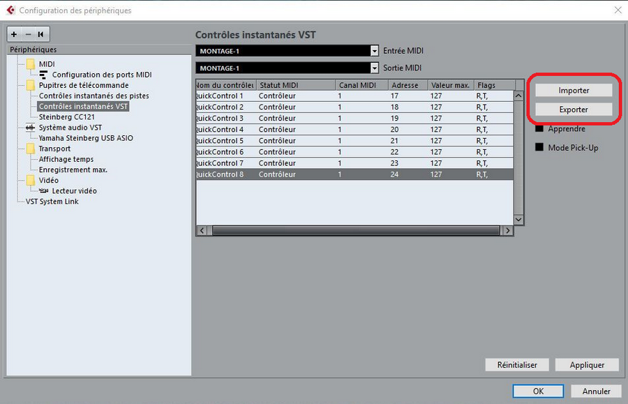 - Cubase va garder ces réglages en mémoire, mais vous pouvez les exporter au format .xml pour avoir par exemple plusieurs réglages disponible selon vos claviers, contrôleurs ...