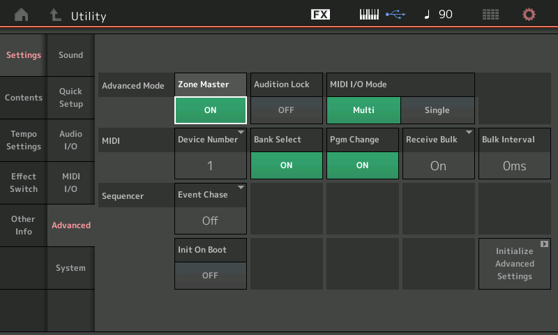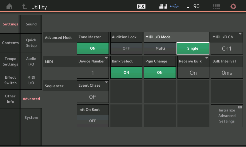 - Au niveau du Montage, si vous travaillez en Midi I/O Multi dans Utility > Settings > Advanced :