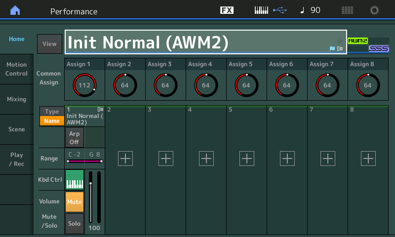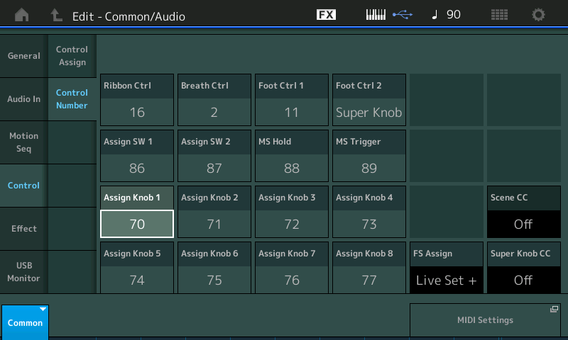 - Sur le Montage vous pouvez toujours utiliser la performance "Init AWM2" cependant il va falloir procéder à une petite modification, allez dans Edit > Common > Control > Control Number et assignez pour les boutons rotatifs les numéros de Control Change de 70 à 77 en lieu et place de 17 à 24 :