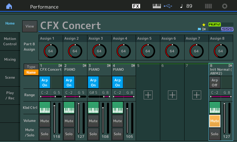 • Les dix autres performances sont des performances Preset modifiée avec la part 8 utilisée en tant que commande Quick Control Remote avec les control change par défaut du Montage de 17 à 24, c'est la part 8 qui a le Quick Control.