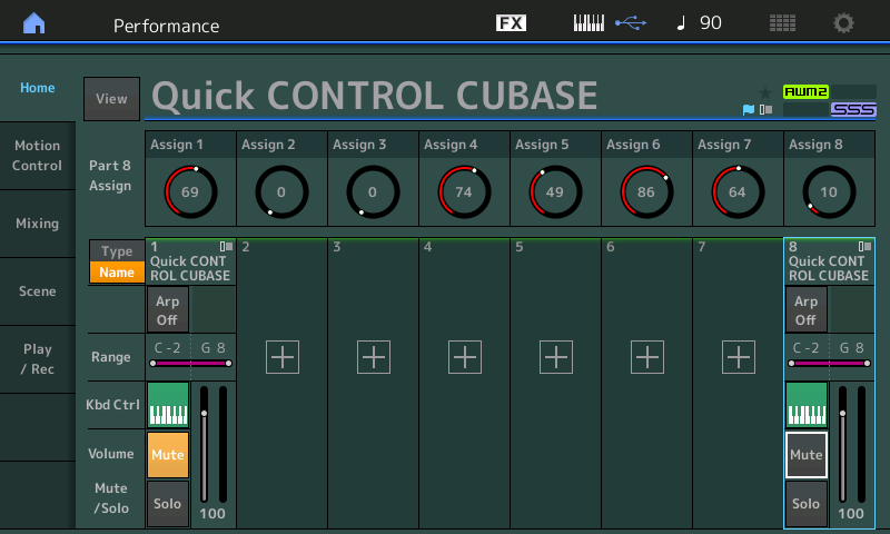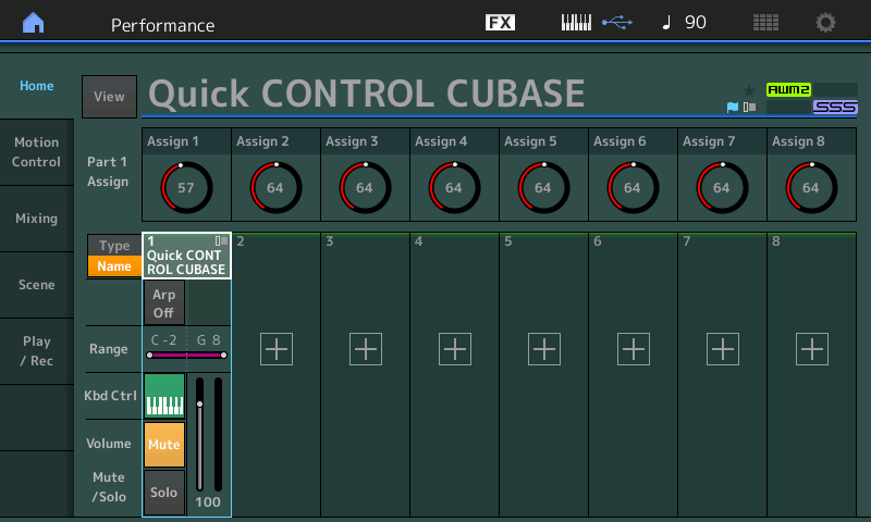 - Sauver cette performance sous un autre nom en tant que performance User, par exemple Quick Control Cubase, vous pouvez maintenant contrôler les huit réglages Quick Connect de Cubase :