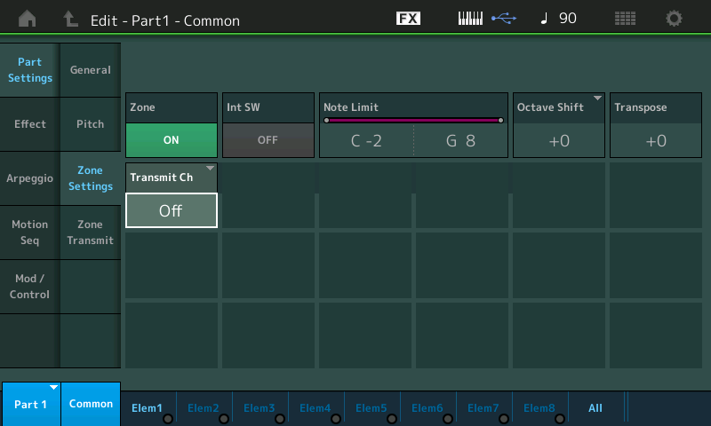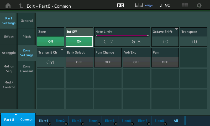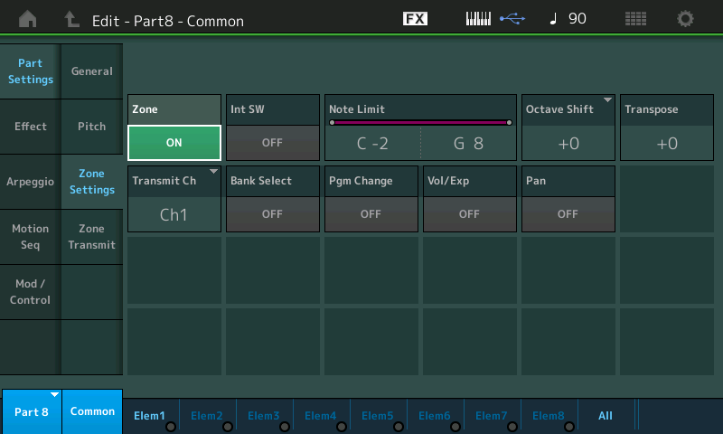 - Sur la part 8, alez en Edit > Part Settings > Zone Settings et activez la zone, par défaut elle est sur le canal midi 1 ce qui nous convient parfaitement pour ne pas avoir à changer les réglages Quick Connect dans Cubase.