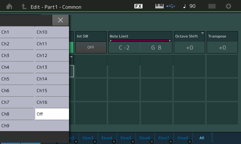 - Sélectionnez la part 1 et Mutez là, restez sélectionné sur la part si vous travaillez en mode Midi I/O Multi, passez en Common si vous travaillez en Midi I/O Single