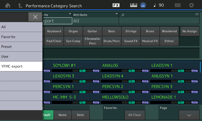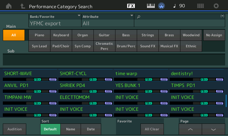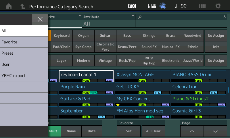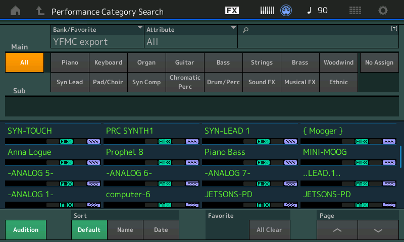 - Pour tester vos nouveaux sons FM, ouvrez Category Search Performance, cliquez sur "Bank Favorite" pour faire apparaître la liste :