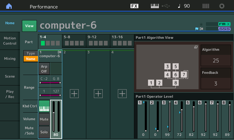 - Ce ne sont pas encore vraiment des sons FM-X, certes les algorithmes à 8 opérateurs sont assignés en correspondance avec ceux à 6 opérateurs par exemple mais les deux porteurs ou modulateurs en sus sont à niveau zéro, ici par exemple se sont les porteurs des opérateurs 1 et 2 qui sont à volume zéro :