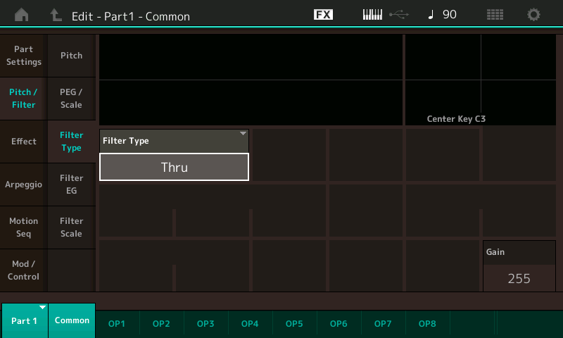 - Par défaut le filtre qui est en Edit Part > Pitch/Filter > Filter Type est sur Thru :