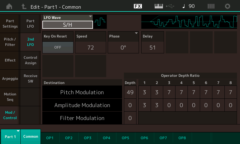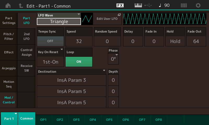- Les deux LFO en Edit Part > Mod / Control > Part LFO ou 2nd LFO ont des réglages basiques, le 2nd LFO a part contre à minima une assignation et un LFO Wave :