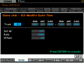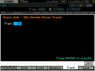 Si vous n'avez pas assez de pistes de libre sur votre song, qu'a cela ne tienne, il vous suffit de copier la piste sur une song vide, d'appliquer la fonction job, et de travailler séparément les grosses caisses, caisses claires, toms, charley/cymbales avec les fonctions job, F2 note, 02 Modify Velocity et 03 Modify Gate Time, une fois la batterie plus humanisée et moins "parfaite", vous regroupez l'ensemble des pistes sur une seule via la fonction job, F5 Track, 03 Mix Track.