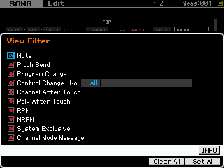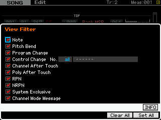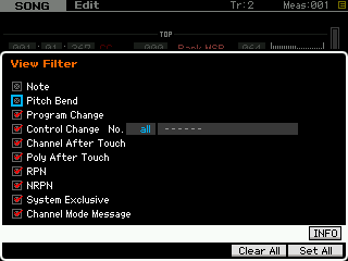 Attention, pour l'aftertouch, vérifiez que dans Seq Set Up, F2 Midi filter, les donnés d'aftertouch ne soient pas filtrées (case cochée), si c'est le cas décocher la ou les cases.