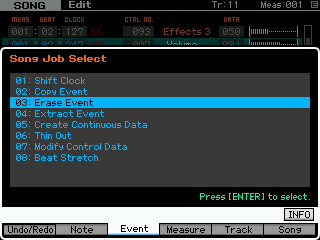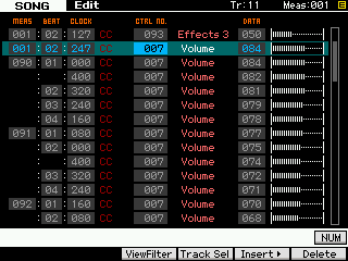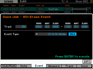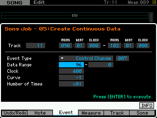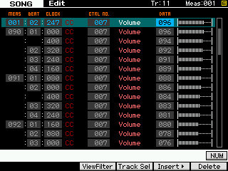 Mais le fondu de sortie de la piste par exemple, lui a été réglé initialement à partir de 84, cela va faire une baisse abrupte, soit il n'y a pas trop de donnés, vous les reprenez à la main et vous modifiez les valeurs, soit la descente contient un grand nombre de donnés, nous allons alors effacer les donnés initiales de volume ou d'expression via la fonction Job, Event, Erase Event, et refaire un fondu propre soit en overdub soit avec la fonction job, event, create continuous data.