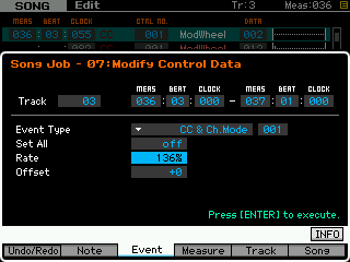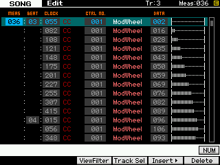 Si cela n'est pas suffisant on pourra modifier le "ratio" de variation des donnés de molette de modulation avec la fonction job, event, 07 Modify Control Data sur le paramètre "CC & Ch mode : 001".