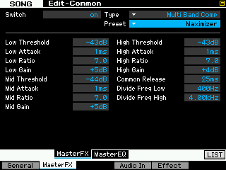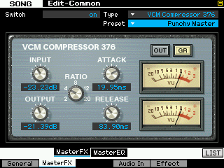 Si cela n’est pas suffisant, vous pouvez utiliser en Master FX (Mixing, Edit Common, F2 Master Fx), un VCM Compressor376 avec un preset Punchy Master ou le Multiband Compressor avec un Preset Maximiser.