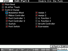 Pour finir, un petit passage par la partie main gauche et un point à explorer sur la guitare Mega à gauche, si vous allez en Edit part3, F6 Rcv Switch, vous pouvez voir que la guitare Mega qui est sur la main gauche réagit à la molette de modulation, essayez et vous allez entendre la différence, par défaut la performance est sauvée avec la molette à fond, même si vous avez la molette en position basse physiquement sur votre Motif XF pour la performance à l'origine quand on la sélectionne, la donnée de la molette est à fond.