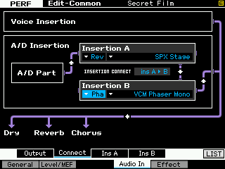La vous pouvez assigner les Dual Insertion Effects pour votre micro, assigner et régler des effets spécifiques via Sf3 InA, Sf4 InsB.