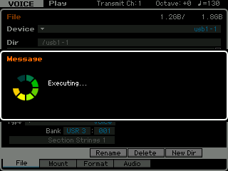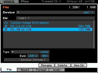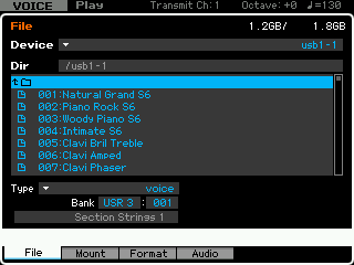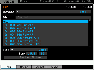 Automatique, vous allez avoir en vue la liste des voices de la clef usb présentes en User1, si la voice à charger est en user2, user3 ou user4, appuyez sur le bouton de sélection de banque la user que vous souhaitez afficher :