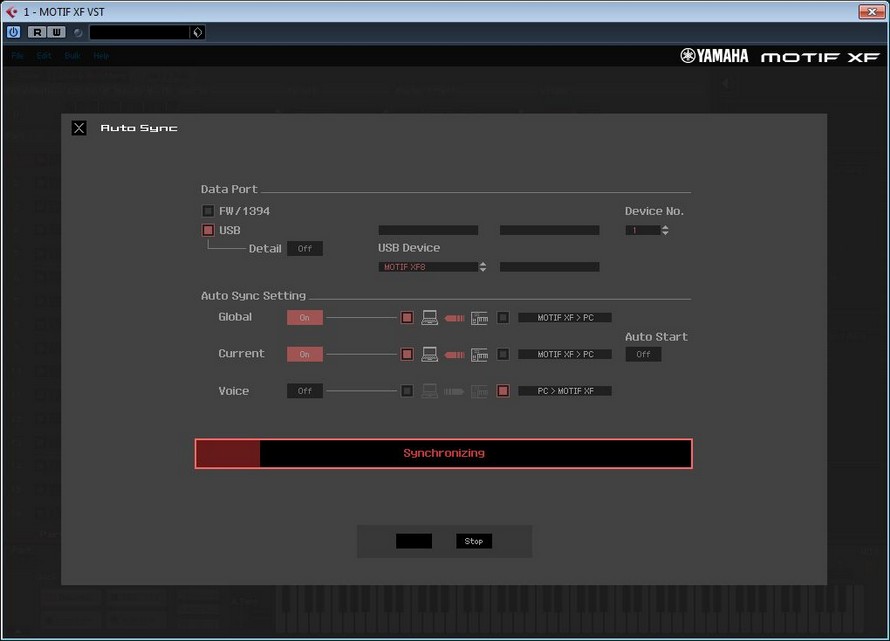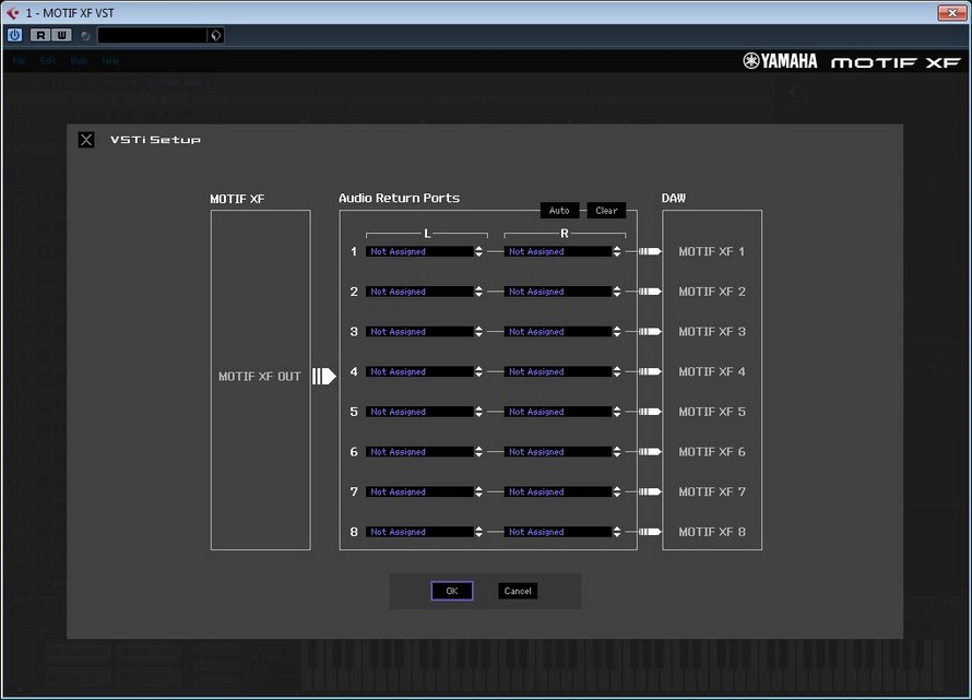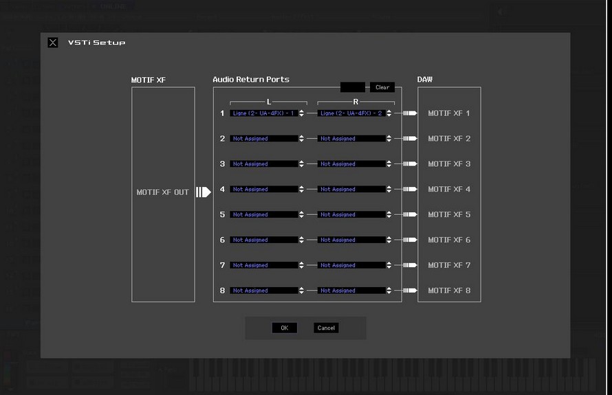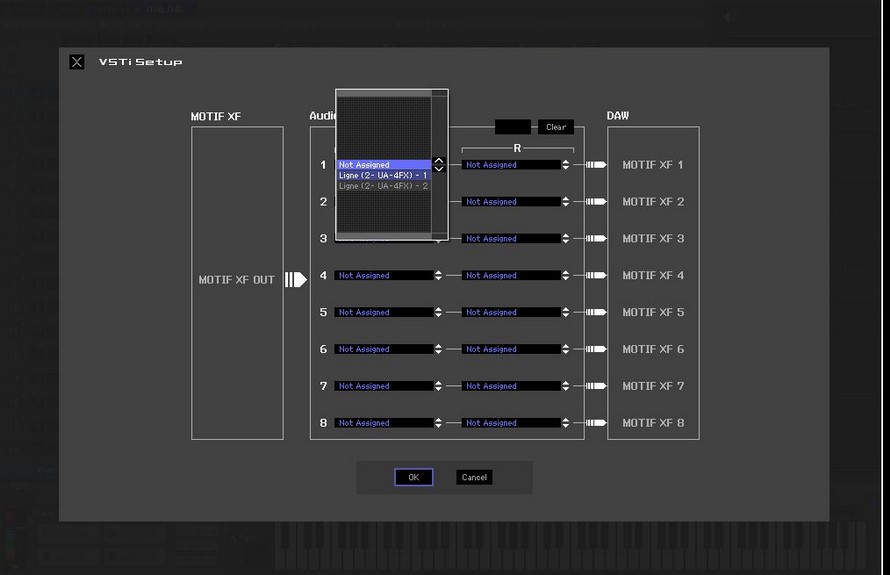 - N'oubliez pas que le VST Editor démontre toute sa puissance lorsqu'il est associé avec l'option firewire du Motif XF et qu'il dispose ainsi de 8 bus audio stéréo ou 14 mono + la sortie L/R FW simultanés, l'enregistrement via une autre carte son permet d'utiliser une partie des capacités du VST Editor.