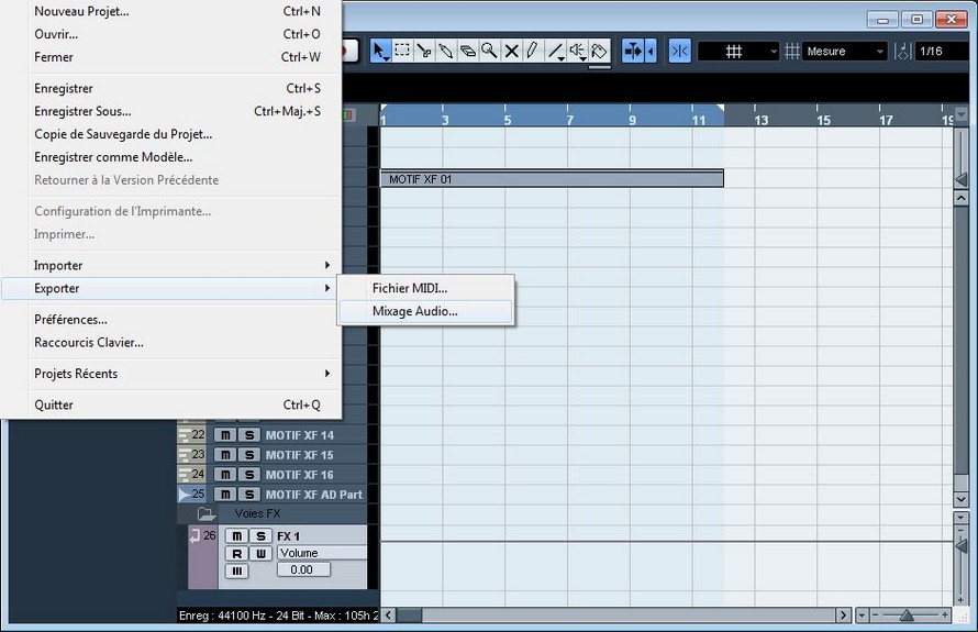 Nous allons maintenant exporter chaque piste midi une à une en piste audio ce qui vopus permet d'utiliser pleinement les effets de cubase qui remplacent les effets system par exemple, ou les part qui n'ont pas les dual insert FX d'activés sans avoir à modifier quoi que ce soit sur votre VST editor, n'oubliez que cette "exportation" ce réalise en temps réel, votre moteur audio étant à l'extérieur de votre ordinateur, c'est votre Motif XF.
