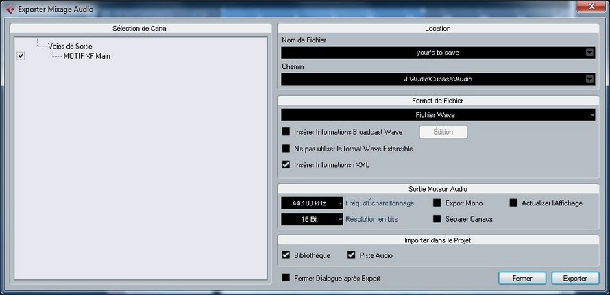 - un point important à comprendre est qu'en fait il n'y a pas "d'enregistrement audio", comme avec tout VST, on effectue une "exportation audio", mais celle-ci ce fait en temps réel lors de la lecture des données midi, votre "moteur audio" étant votre Motif XF qui à la différence d'un VST "standard" n'est pas dans votre ordinateur, mais relié à votre carte son.