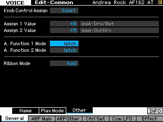 - pour les Assignables Function 1 et 2, il faut assigner les CC 86 et 87 pour bénéficier des fonctions AF1/2 "Xpanded Artikulation" lorsqu'elles sont programmées dans la voice.