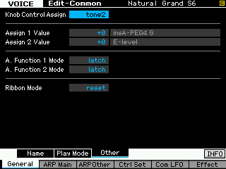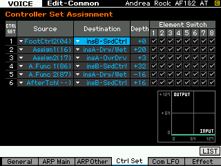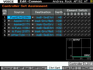 Il faut donc choisir soigneusement les réglages que l'on va faire, comme dans la capture ci-dessous à gauche et également pour chaque voice sur l'écran edit common, F4 Ctrl Set, ci-dessous à droite, bien gérer les sources et destinations des contrôleurs.