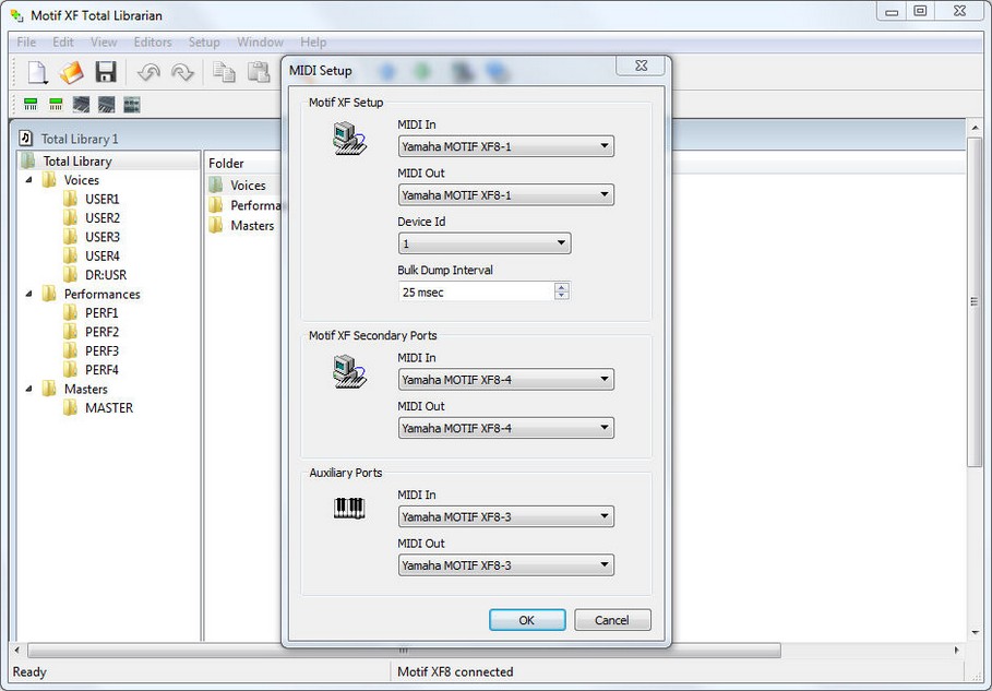 Continuons, vous souhaitez reste en mode usb avec votre ordinateur allumé et utiliser un clavier ou rack connecté, pas besoin de logiciel séquenceur, vous utilisez les XF Tools de John Melas (Total Librarian, Voice Editor …) avec votre Motif XF et un autre clavier connecté lui via les prises midi in/out de votre Motif XF.