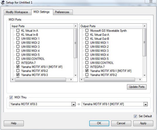 Sélectionnez dans les midi ports en input et output ports, les ports 1, 3 et 4 :