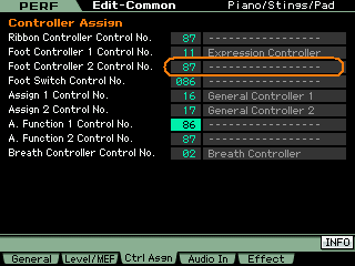 Pour les réglages associés à un contrôleur vers le CC84, il est disponible par song à l'identique du mode performance dans mixing edit common, F3 Ctrl Assgn, la vue est identique à celle du mode performance.