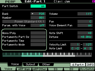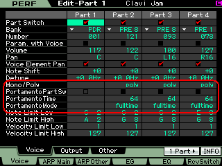 On peut choisir mono ou poly, l'activation de la part est reportée ici (à l'exception des drum kits), le portamento time pour chaque part (voice) qui compose la performance et le portamento mode, fingered ou fulltime.