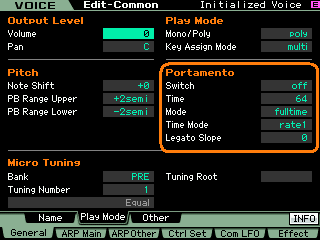 Si on souhaite pouvoir aller aussi loin qu'en mode voice, il faut au préalable travailler chaque voice de la performance ou le portamento est souhaité en mode voice et sauver chaque voice en tant que User voice.