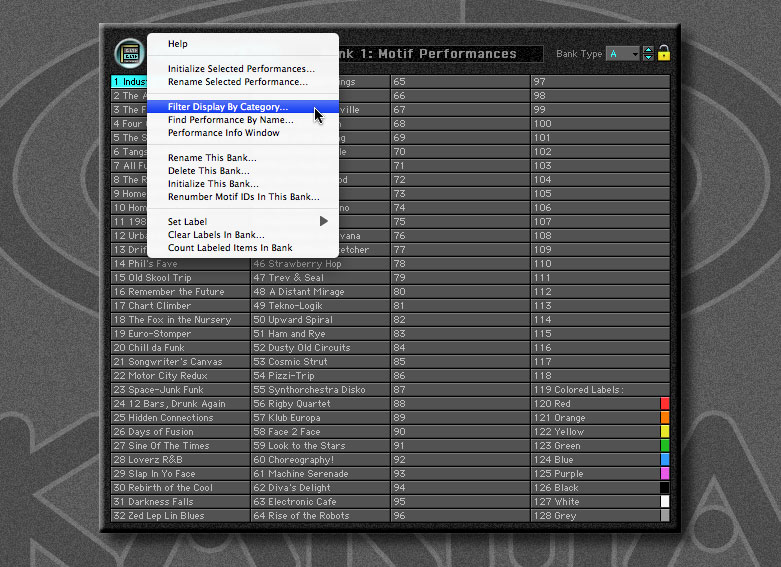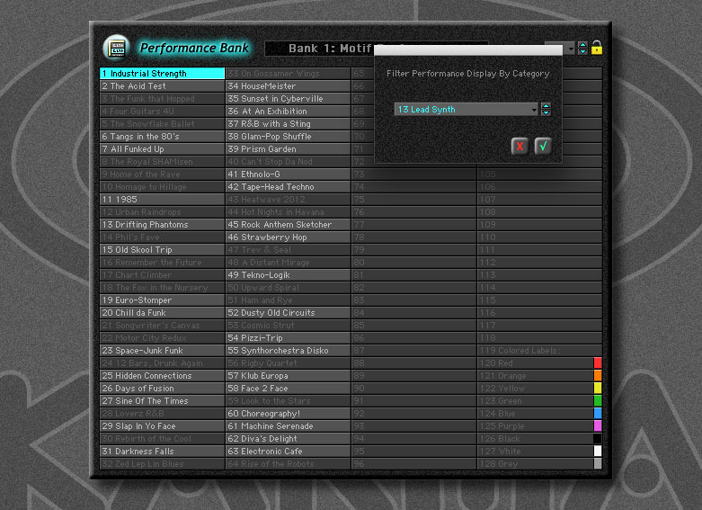Par exemple, sélectionnez «Industrial Strength" - puis allez dans : Performance Editor, Other page, et changez le numéro de la song.