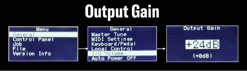 Le gain de sortie se trouve dans [MENU]>Général>Volume E/S :