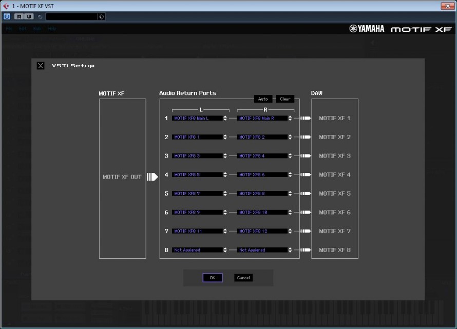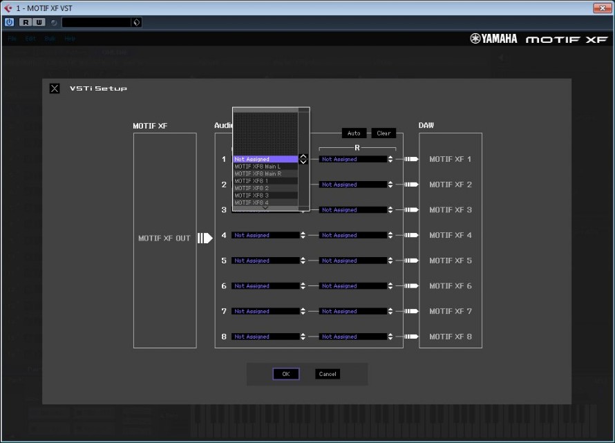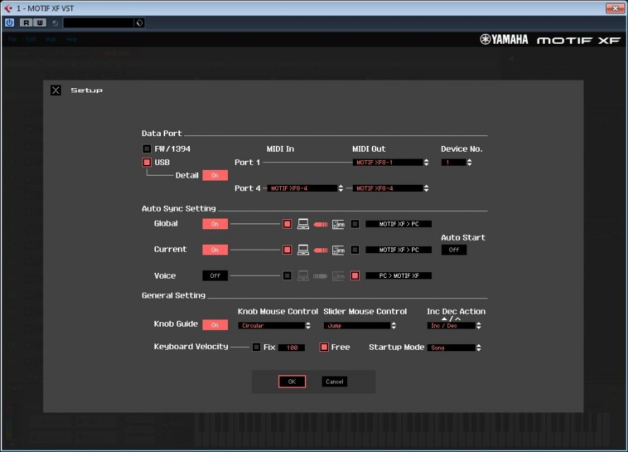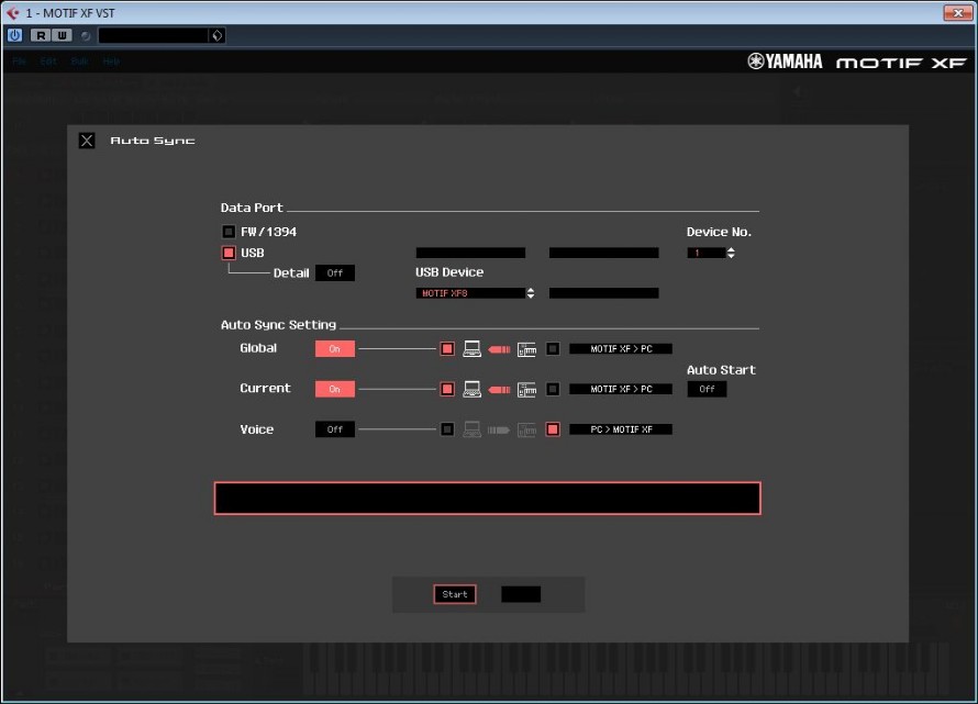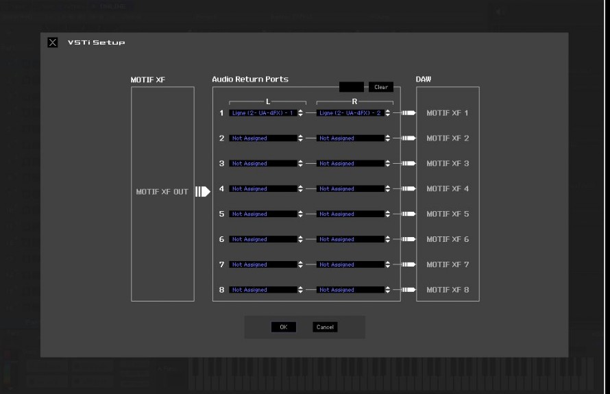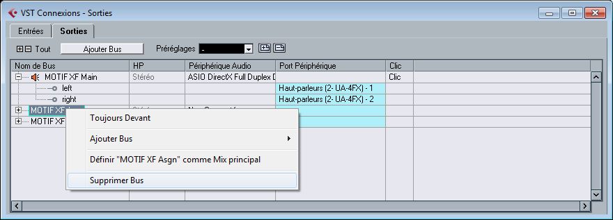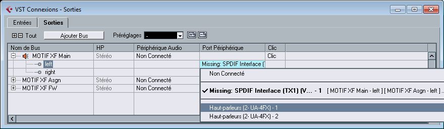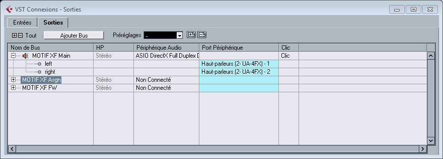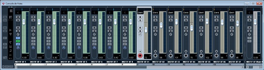 - N'oubliez pas que le VST Editor démontre toute sa puissance lorsqu'il est associé avec l'option firewire du Motif XF et qu'il dispose ainsi de 8 bus audio stéréo ou 14 mono + la sortie L/R FW simultanés, l'enregistrement via une autre carte son permet d'utiliser une partie des capacités du VST Editor.